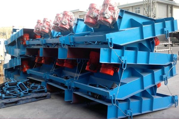 振動給料機可以把塊狀、顆粒狀物料從料倉中均勻、連續(xù)地喂料到受料裝置中;在砂石生產(chǎn)線中可以為破碎機連續(xù)均勻地喂料避免破碎機受料口堵塞;專為破碎篩分中粗破碎機前均勻輸送大塊物料設(shè)計。振動給料機采用雙偏心軸激振器的結(jié)構(gòu)特點,保證設(shè)備能承受大塊物料下落的沖擊,給料能力大。在生產(chǎn)流程中可以把塊狀、顆粒狀物料從貯料倉中均勻、定時、連續(xù)地給到受料裝置中去,從而防止受料裝置因進(jìn)料不均而產(chǎn)生死機的現(xiàn)象,延長了設(shè)備的使用壽命。給料機可分為鋼板結(jié)構(gòu)和篦條結(jié)構(gòu),鋼板結(jié)構(gòu)的給料機多用于砂石料生產(chǎn)線,將物料全部均勻地送入破碎設(shè)備;篦條結(jié)構(gòu)的給料機可對物料進(jìn)行粗篩分,使系統(tǒng)在配置上更經(jīng)濟合理,在破碎篩分中已作為必不可少的設(shè)備。